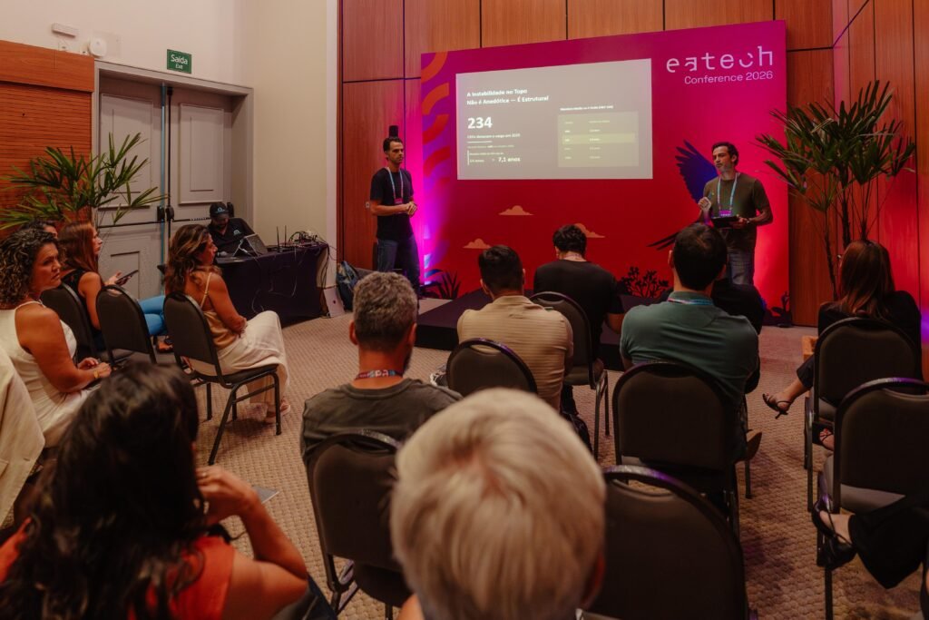 Essa crescente relevância dos líderes de tecnologia foi destaque em vários momentos do Eatech Conference 2026. Um exemplo foi a conversa em uma das salas paralelas, guiada pela reflexão “como o mercado está redesenhando o papel do CIO”. O momento foi conduzido por Paulo Moraes e Alexandre Benedetti, representantes da LANDtech, empresa especializada no recrutamento de profissionais de tecnologia e do universo digital.