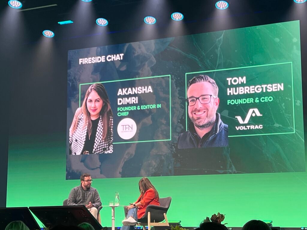 Tom Hubregtsen, CEO da Voltrac, ao ser entrevistado no Climate Summit, no Slush 2025